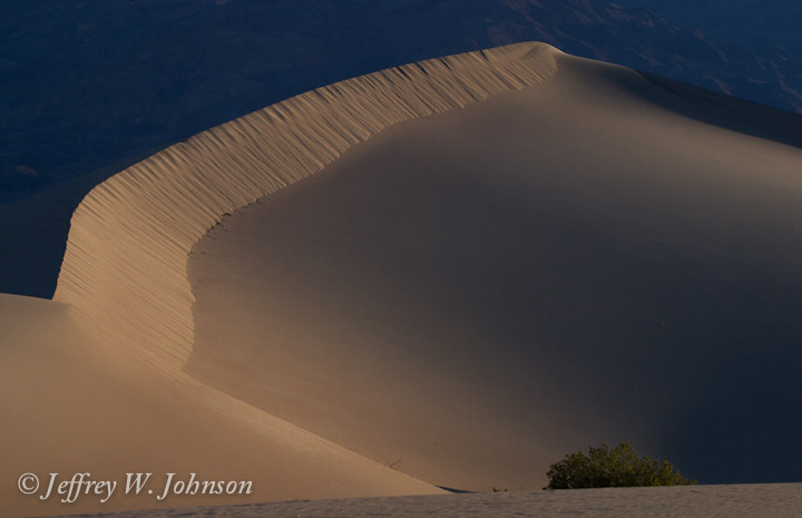 While at Death Valley, Stovepipe Wells was our base of operations. It gets its name from the old well out near the dunes that was marked with a length of stovepipe. It's close to the Stovepipe Wells sand dunes and away from the congestion of Furnace Creek (the center of most tourist activity). It's a great place to sleep, but does have some drawbacks. For example: the rooms have comfortable beds, but no phone, TV, or drinking water (I found 2 payphones on the property and there was drinking water just outside our room); there is only one dining room with a modest menu (they make wonderful blueberry pancakes and a great stir-fry); the only store ran out of Diet Coke and caramel corn by the end of the weekend. Joking aside, I would chose to stay here again (all that is important is a comfortable bed and electrical outlets). Our itinerary included a sunset and sunrise shoot on the nearby dunes. We elected to shoot sunrise on the dunes the day we left as well, but by then there had been a lot more foot traffic on the dunes. I've included a number of shots on the dunes.